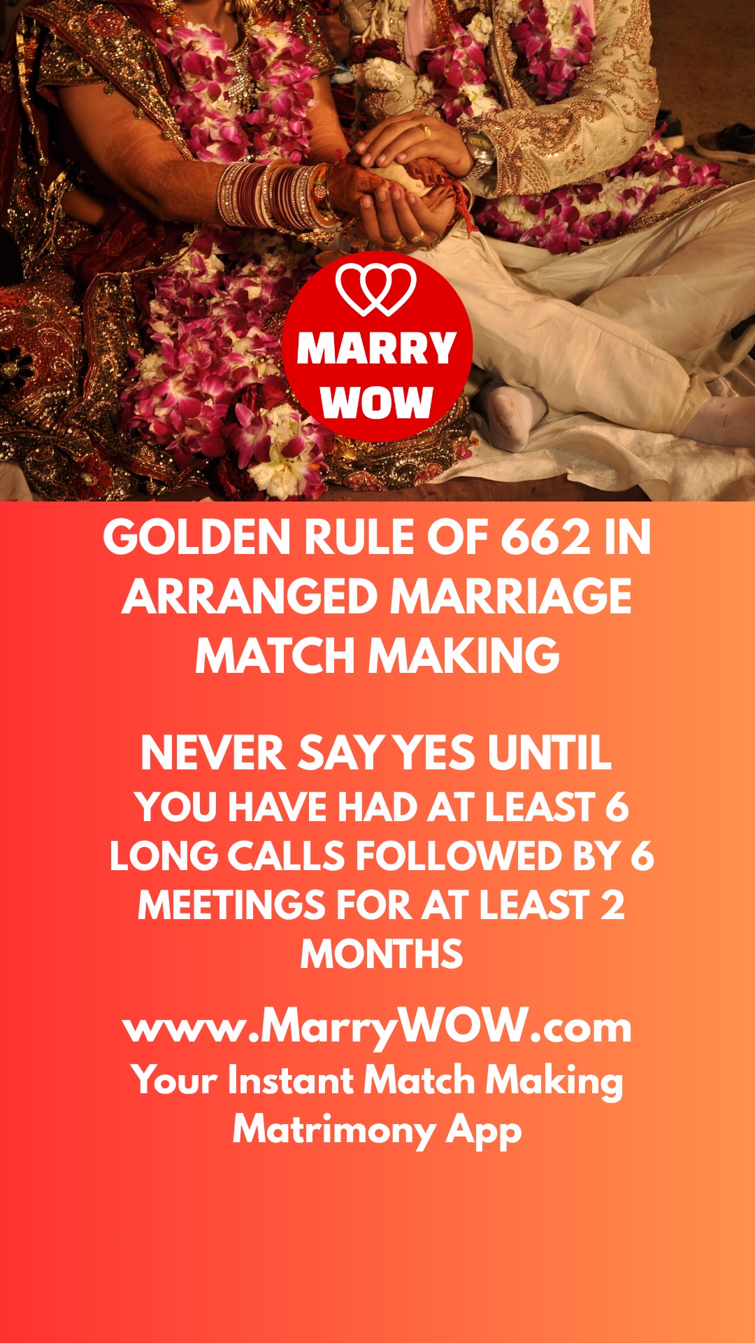 GOLDEN RULE OF 662 IN ARRANGED MARRIAGE MATCH MAKING. NEVER SAY YES UNTIL YOU HAVE HAD AT LEAST 6 LONG CALLS FOLLOWED BY 6 MEETINGS FOR AT LEAS ...