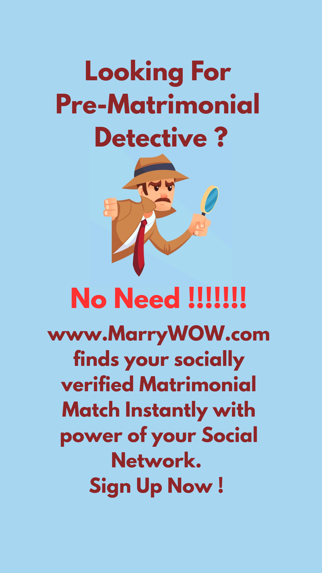 Looking For Pre-Matrimonial Detective ? No Need ! www.MarryWOW.com finds your socially verified Matrimonial Match Instantly with power of your ...