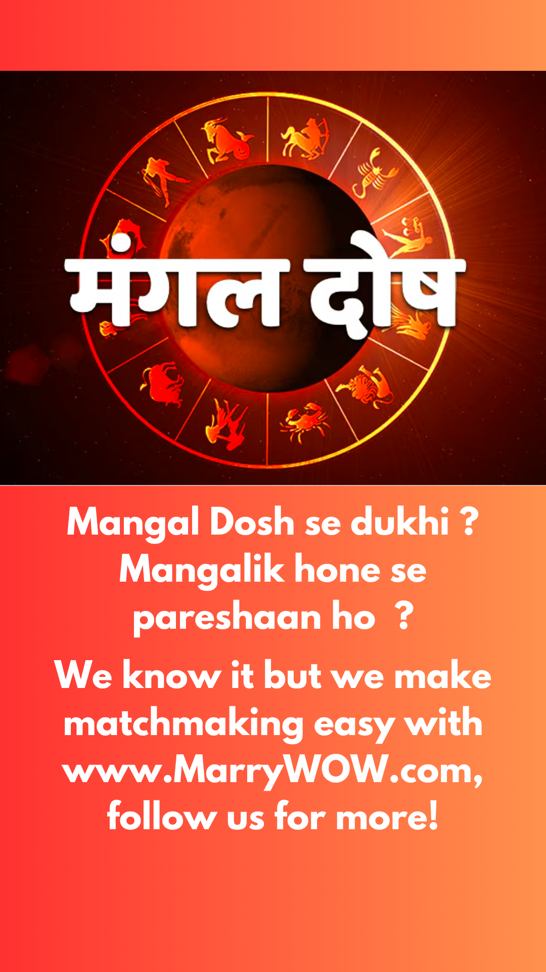 MarryWOW says : Mangal Dosh se dukhi ? Mangalik hone se pareshaan ho ? We know it but we make matchmaking easy with www.MarryWOW.com